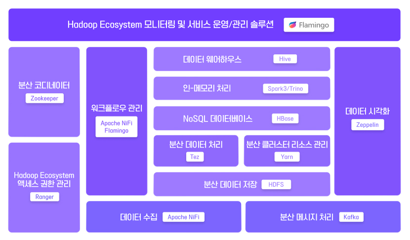 아시다시피, Hadoop은 다양한 요소로 구성되어 있기에 이들간 호환성 또한 중요합니다. EBIGs를 통해 Hadoop, Hive, Spark, Zookeeper, HBase, Nifi, Kafka 등을 모두 조화롭게 모니터링과 관리가 가능합니다.