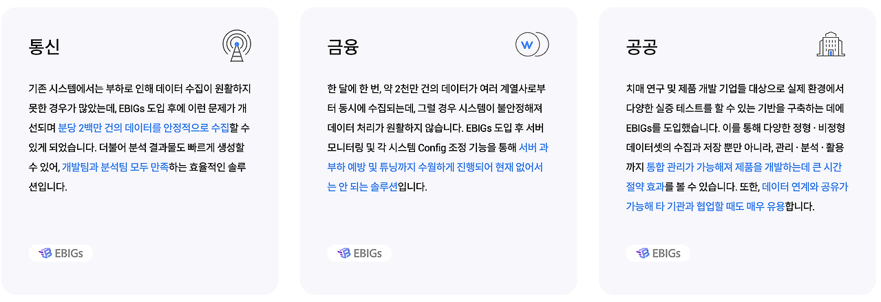 공공기관 A는 다양한 정형 · 비정형 데이터셋의 수집과 저장부터, 관리 · 분석 · 활용은 물론, 원활한 데이터 연계 및 공유가 가능한 통합 인프라 구축을 고려하고 있었던 시기에 EBIGs를 도입했습니다. 통합 관리는 물론, 서버 및 서비스의 정상 작동 여부, HW 자원 상태 모니터링 등이 가능해, 제품을 개발하는데 소요시간이 줄고, 타 기관과 협업할 때도 매우 유용했다는 후기를 공유해 주었습니다.