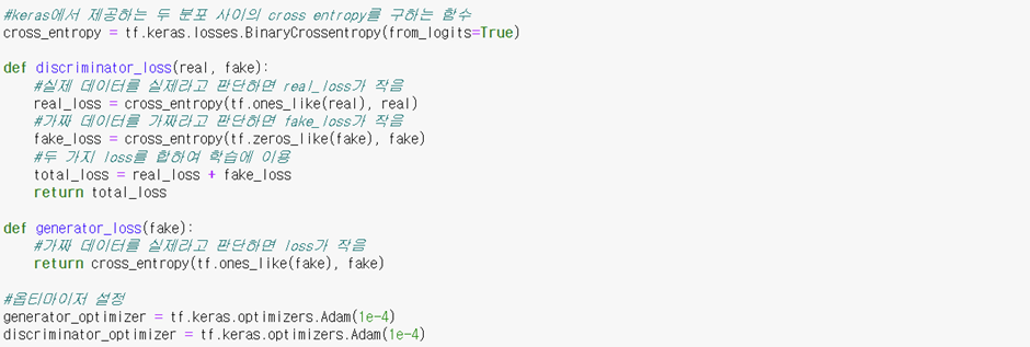 손실함수를 생성해보자. 판별자 손실함수는 아래의 주석처럼 실제 데이터를 실제라고 판단하는 정도와 가짜 데이터를 가짜라고 판단하는 정도로 결정되고 생성자 손실함수는 가짜를 실제라고 판단하는 정도로 결정된다. 최적함수로는 Adam을 이용하였다.