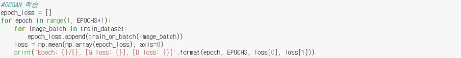 손실함수를 위와 같이 사용자가 정의할 경우 tensorflow에서 제공하는 compile 메서드를 이용할 수 없다. 대신에 tensorflow는 @tf.function 데코레이터 기능을 제공한다. 이 데코레이터는 함수를 컴파일해준다. 아래의 함수 train_on_batch의 역할은 이름 그대로 batch마다 가중치를 업데이트 해주는 것이다. 먼저, generator에 입력할 잡음을 생성한다. 다음으로 위에서 만든 loss 함수를 이용해 generator와 discriminator의 손실을 구한다. 이때, GradientTape API를 이용하면 좋다. GradientTape는 구문 안에서 실행된 모든 연산을 Tape에 기록한다. 따라서 이후 tape.gradient를 통해 함수의 미분값인 gradient를 쉽게 얻을 수 있다. 획득한 gradient를 apply_gradient를 통해 가중치에 업데이트하면 배치 1개의 학습이 완료된다.