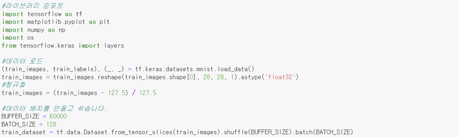 tensorflow를 포함한 실습에 필요한 몇몇 라이브러리를 임포트하였다. MNIST 이미지를 다운로드 받은 후 정규화 및 학습에 이용하기 위해 적당한 배치로 나누었다. 이때, 127.5를 이용해 정규화를 진행함을 확인할 수 있는데 이는 픽셀 값의 분포가 [0,255]이므로 이를 [-1,1]로 옮겨오기 위함이다.
