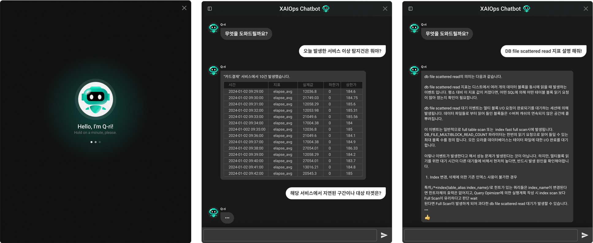 엑셈이 개발한 챗봇 이름은 ‘QURI(큐리)’입니다. 생성형 AI 기술과 대규모 언어모델(LLM)을 도입한 대화형 챗봇으로, 위에서 소개한 XAIOps에 먼저 적용했습니다. IT 운영자들은 QURI에게 IT 시스템의 운영 상황을 질문할 수 있습니다. 이를 테면, “최근 1시간 동안의 장애 발생 내역은?”, “방금 답변해 준 서비스에서 지연된 구간이나 대상 타깃은?”, “현재 시스템 이상에 대한 장애 예측 상황은?”과 같은 질문들이죠. 그럼 QURI는 엑셈이 23년간 900여 고객을 지원하며 축적해온 성능 관리 경험과 노하우를 담아 답변합니다.