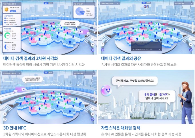 특히 서울시 빅데이터 플랫폼 구축 사업은, 2단계 사업에서 엑셈이 주관사로 플랫폼을 성공적으로 구축한데 이어, 3단계 사업에서도 수주에 성공한 것입니다. 대형언어모델(LLM) 기반 생성형 AI를 적용함에 따라, 기존 AI 챗봇 검색 서비스와 인구 관련 각종 데이터를 확인할 수 있는 GIS 기반 메타버스 테마관인 ‘서울 인구관’을 새롭게 개선해 나갈 계획입니다.