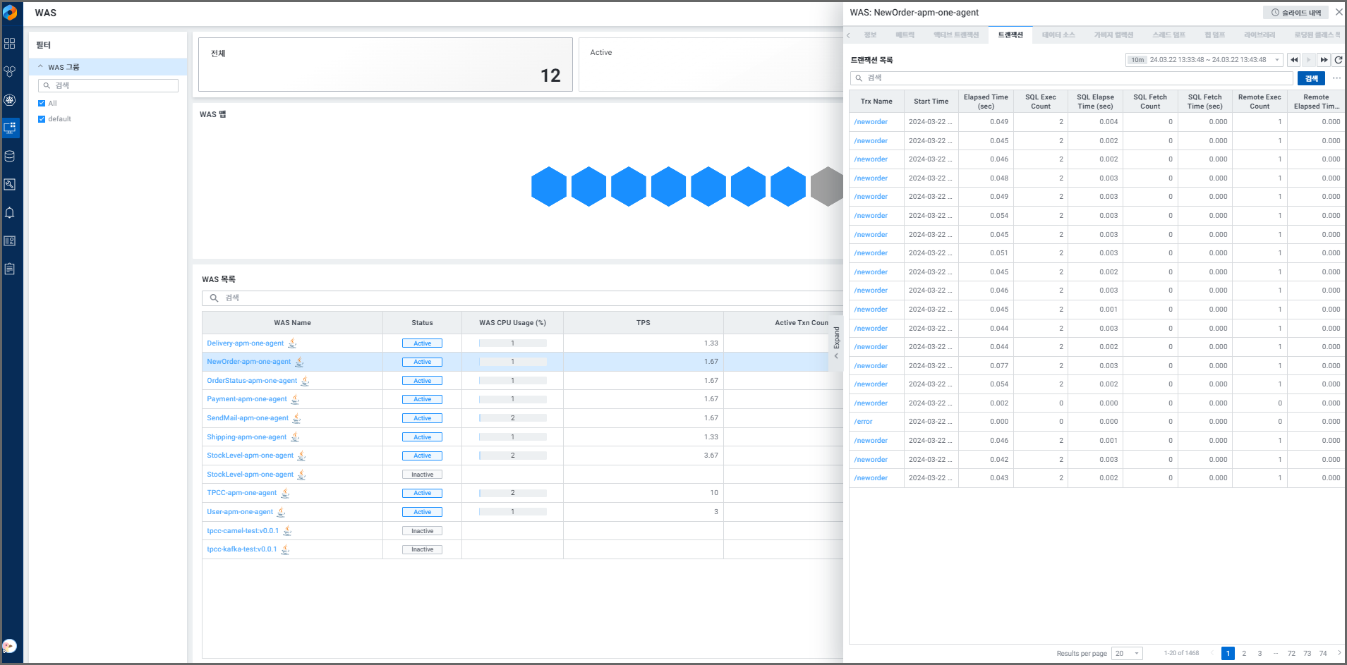 Drill-in 방식의 UI/UX를 제공합니다. 서버, 애플리케이션, DB 요소를 클릭하여 디테일한 정보를 확인할 수 있습니다. 이에 그치지 않고, 디테일 화면에서 또 추가 클릭하면 더 뎁스 있는 정보로 이동합니다.