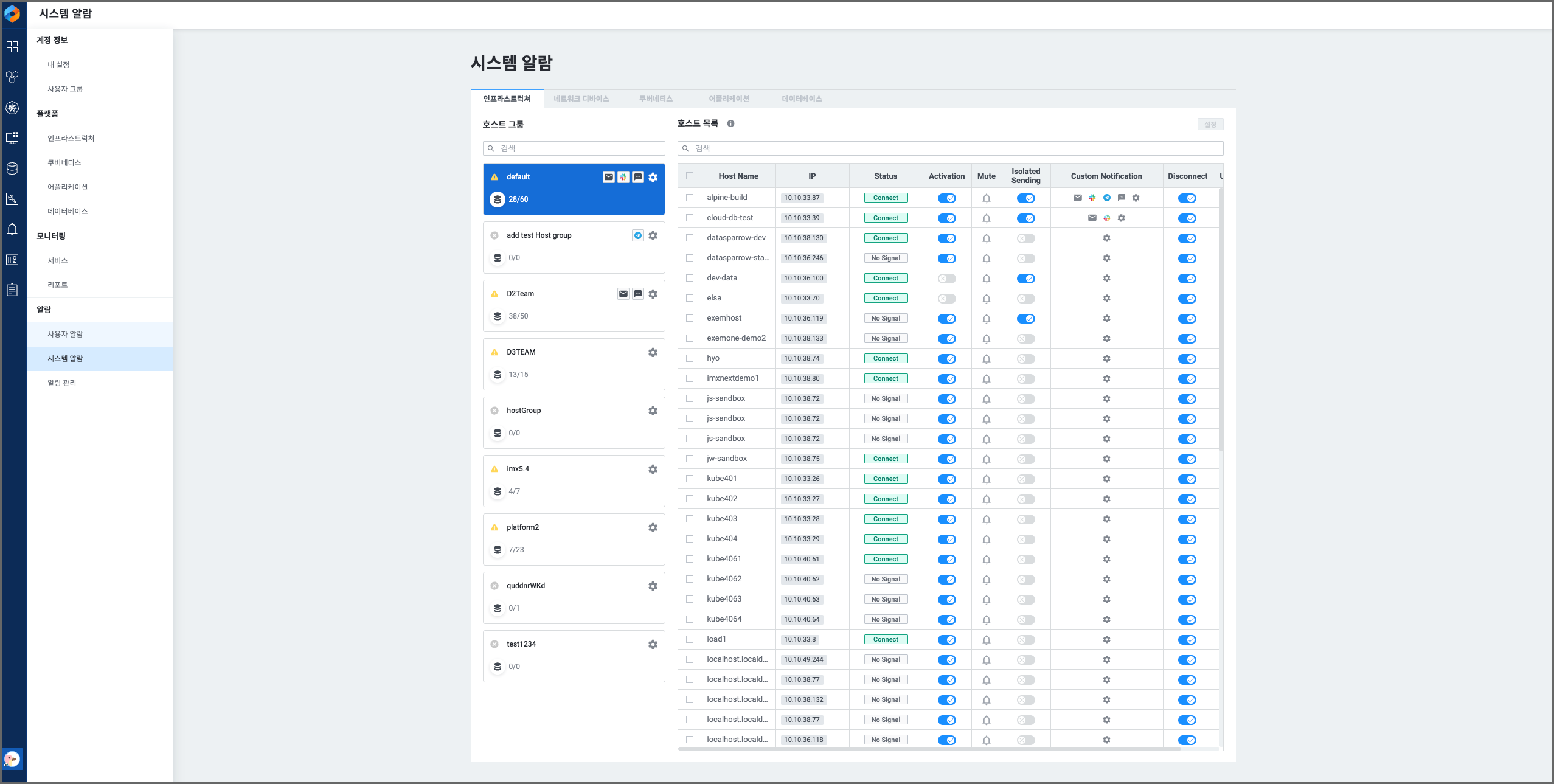 Email, Slack, Telegram, SMS 등 다양한 채널로 알람을 받을 수 있습니다. 알람은 시스템 알람, 유저 알람을 구분하여 셋팅 및 수신하고 쉽고 명료한 UI/UX를 제공하여 사용이 쉽습니다.