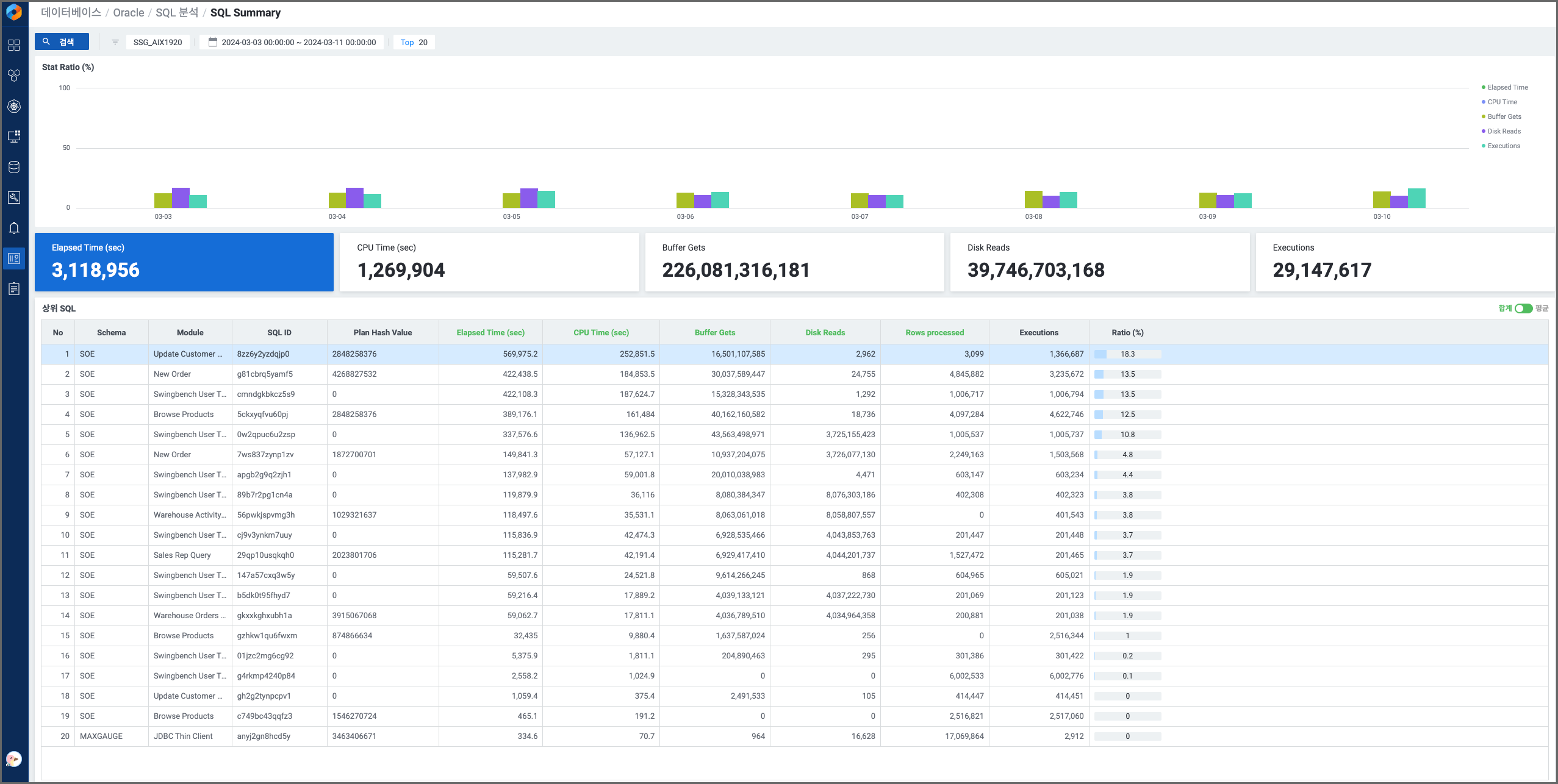 엑셈의 경험과 레퍼런스로 만들어진 분석 도구를 제공합니다. Oracle, PostgreSQL, MySQL, SQL Server 등 각 데이터베이스를 위한 성능 분석에 필요한 화면 및 데이터를 제공하고, 복수의 지표 추이, 통계, 비교 기능을 제공합니다.