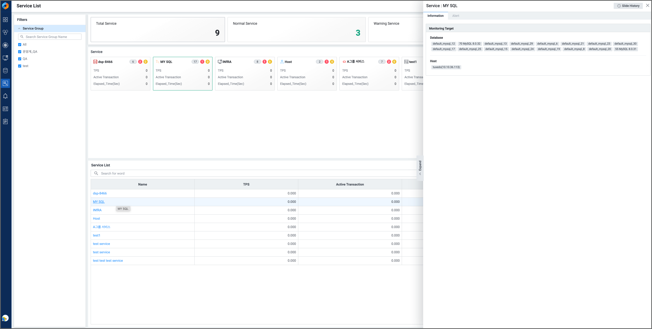 비즈니스 단위로 인프라 모니터링이 가능한 화면을 제공합니다. 데이터베이스, 애플리케이션, 서버 등 각 영역으로 수집된 데이터를 비즈니스 단위로 재정립하여 한 눈에 볼 수 있는 화면입니다. DB 관리자와 운영자 간의 문제 인식과 협업의 허들을 낮춥니다.