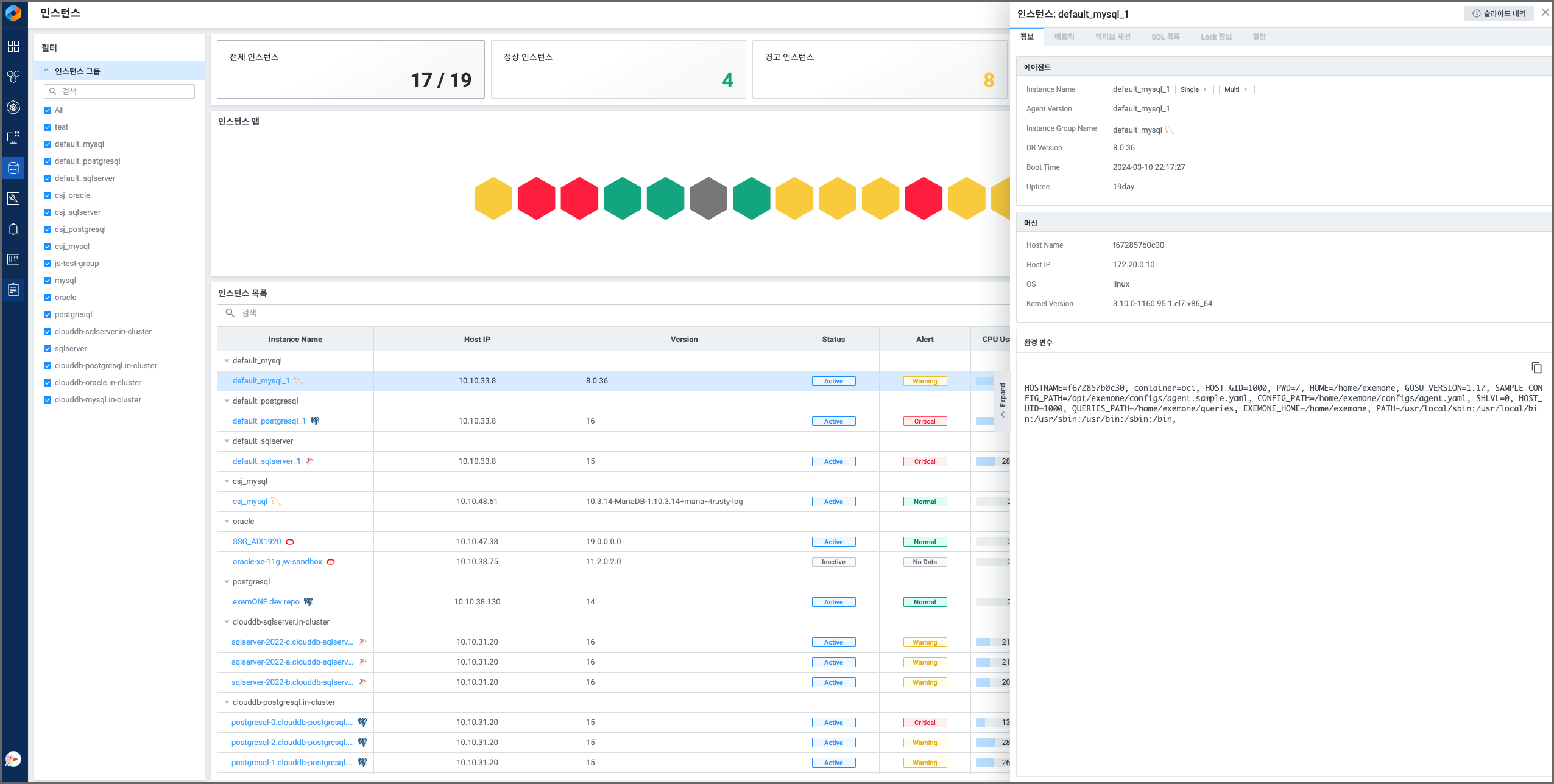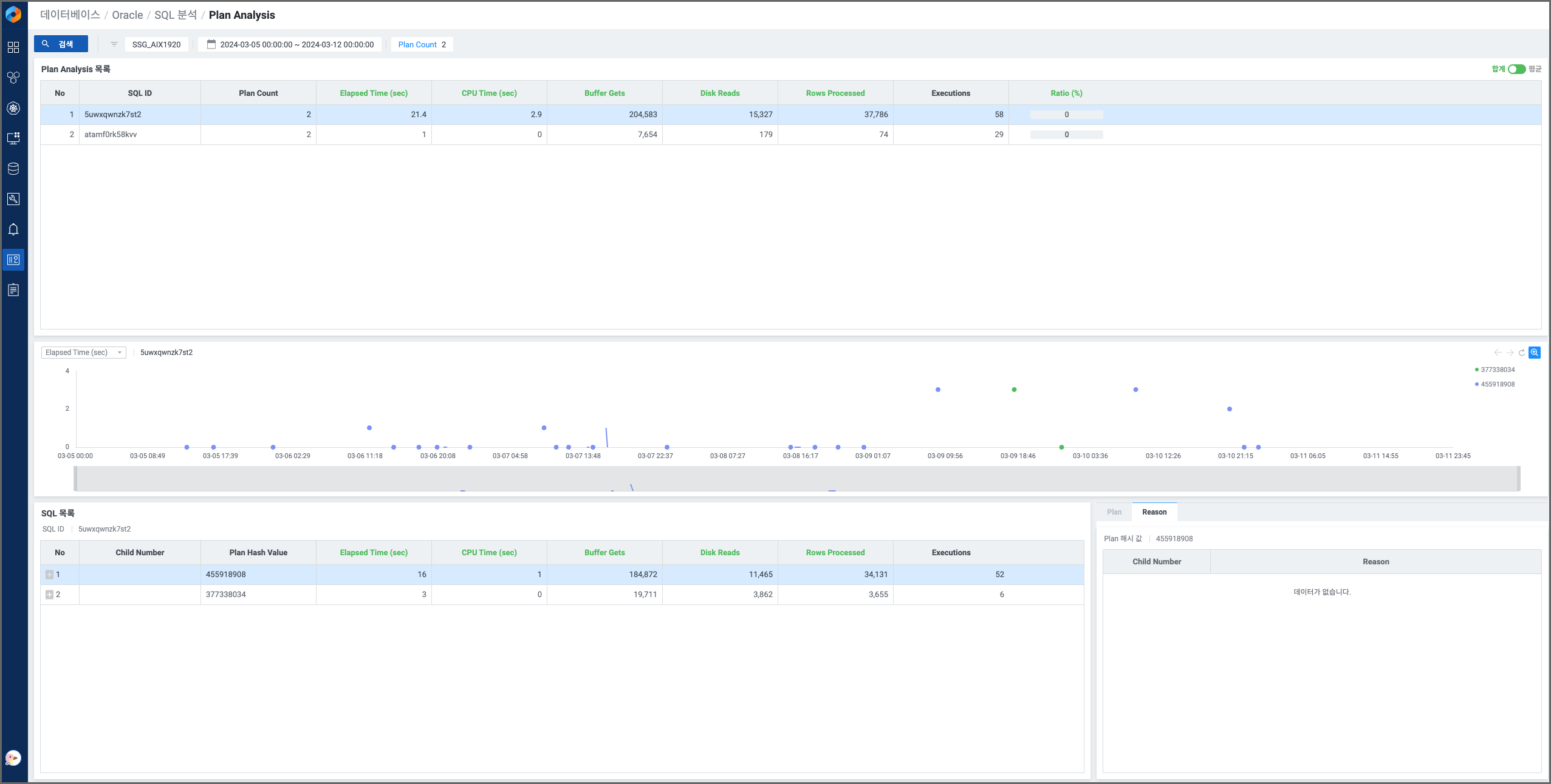 엑셈의 경험과 레퍼런스로 만들어진 분석 도구를 제공합니다. Oracle, PostgreSQL, MySQL, SQL Server 등 각 데이터베이스를 위한 성능 분석에 필요한 화면 및 데이터를 제공하고, 복수의 지표 추이, 통계, 비교 기능을 제공합니다.