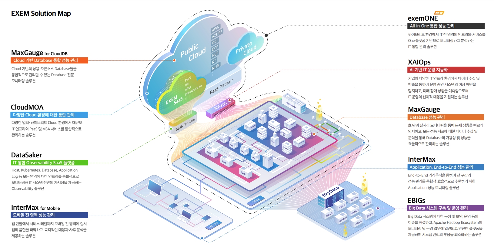 DBPM, APM, 빅데이터, 지능형 IT, 클라우드에 이어 풀 스택 Observability까지 IT 운영 관리에 필요한 모든 것을 엑셈 솔루션으로 해결할 수 있습니다. exemONE을 통해 고객 환경의 혁신을 이끌어낼 수 있도록 많은 준비가 이루어지고 있습니다. 전체를 하나로 보는 편리함. 익숙해지면 벗어날 수 없죠. 이제 exemONE 하나면 충분할 것 같습니다.