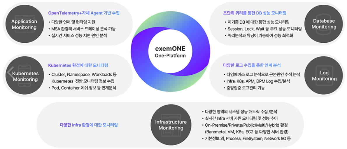 엑셈원은 서버·쿠버네티스·데이터베이스·애플리케이션·로그 등 시스템 전체 영역 실시간 성능 모니터링뿐만 아니라 장애 사후 분석, 문제 추적을 수행하는 풀스택 옵저버빌리티 솔루션이다. 그간 엑셈이 DB나 애플리케이션 성능관리, 클라우드 관제 등 원포인트 솔루션 중심으로 제품을 출시하던 것과 달라진 점이다.