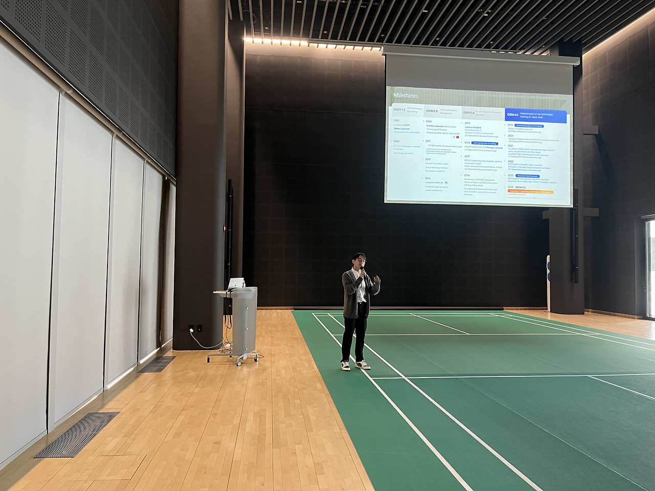 이 날은 방문자 수가 많은 관계로, 혹여 엑셈 스토리를 놓치실까봐 투어는 특별히 2팀으로 나누어 진행했습니다. 배드민턴 구장으로도, 강연장으로도 변신이 가능한 필리노베이터 홀에서 세션을 진행했습니다.