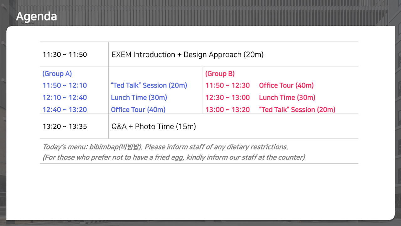 엑셈 투어가 공식적으로 2년 째 진행되고 있는데도 찾아주신 분들과 매번 만날 때마다 설렙니다. 한 분 한 분께 좋은 추억이 될 수 있도록, 또 누군가에게는 동기부여가 될 수 있도록, 방문객 연령층, 방문 목적, 문화 배경을 고려해 매번 맞춤형 투어를 제공합니다. 엑셈 투어는 한국어 뿐만 아니라 중국어, 일본어, 영어로도 가능해서 글로벌 친구들이 선호합니다. Agenda 한 번 보실래요?