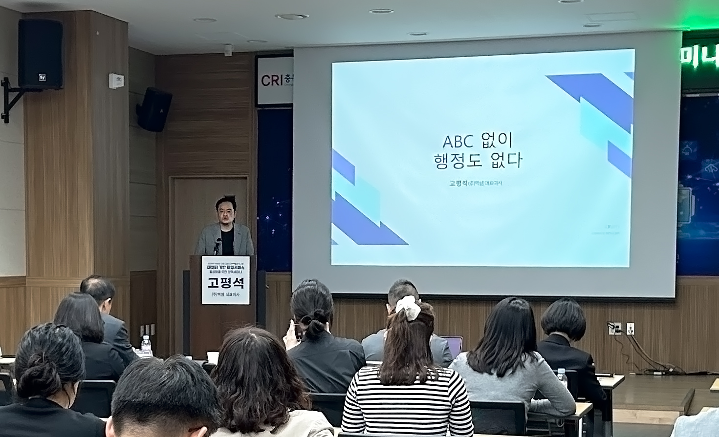 ▲ 8일 엑셈 고평석 대표가 충북연구원 1층 대회의실에서 열린 ‘데이터 기반 행정서비스 활성화를 위한 정책세미나’에서 데이터 기반 행정서비스 활성화 사례 및 전략을 제시하고 있다.