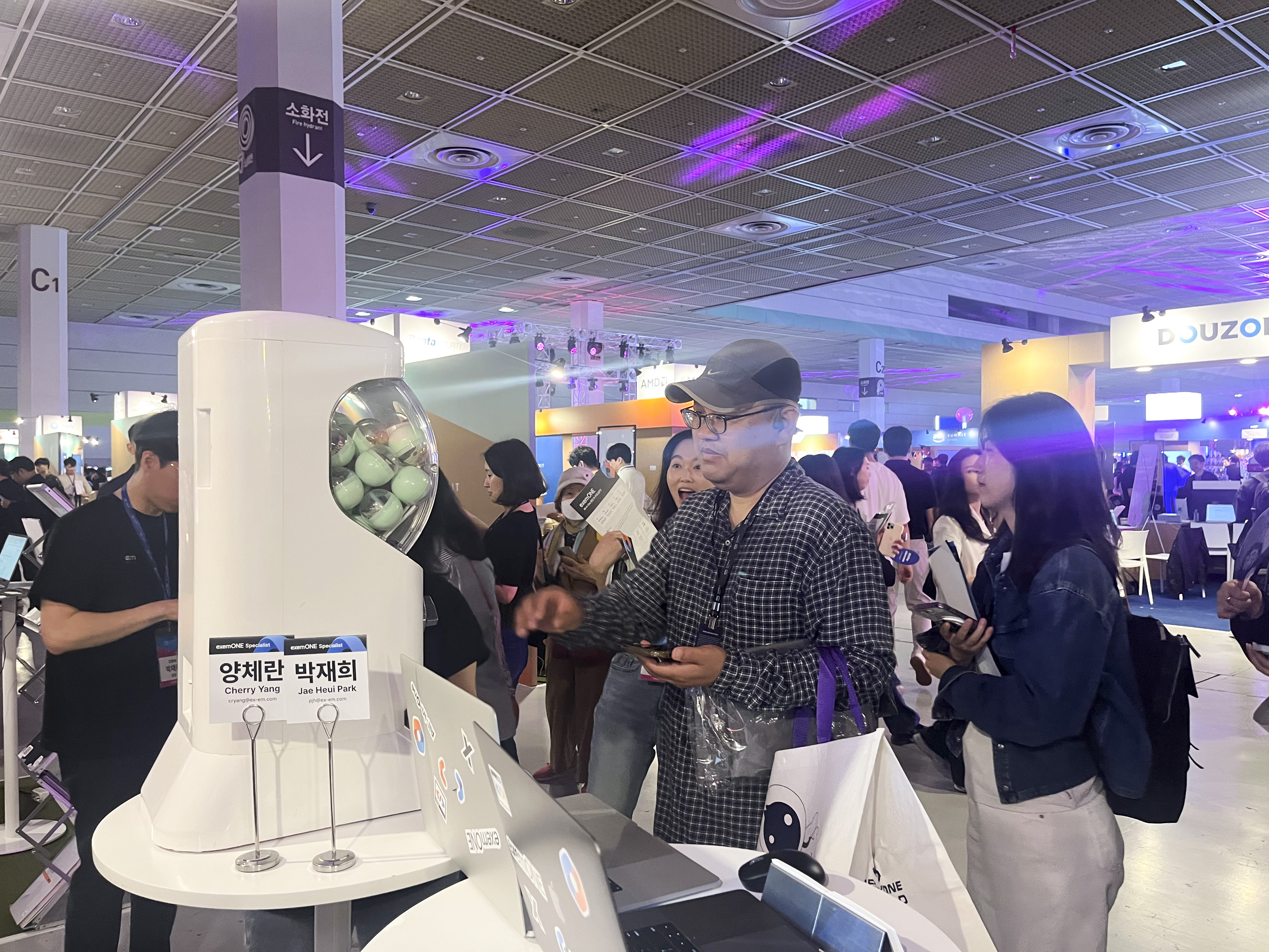 몇 년만에 오프라인에서 고객분들과 만나는 자리라 엑셈 부스에 오신 한 분 한 분의 양손을 가득 채워드리고 싶은 마음이 컸어요! 그래서 준비한 뽑기 이벤트. 기프트로 캡슐 커피머신과 스벅 상품권 5만원권, 선풍기, 엑셈 제작 티셔츠 등을 아낌없이 준비했습니다. SNS 채널 구독만 해도 exemONE 장바구니를 겟하셨구요.