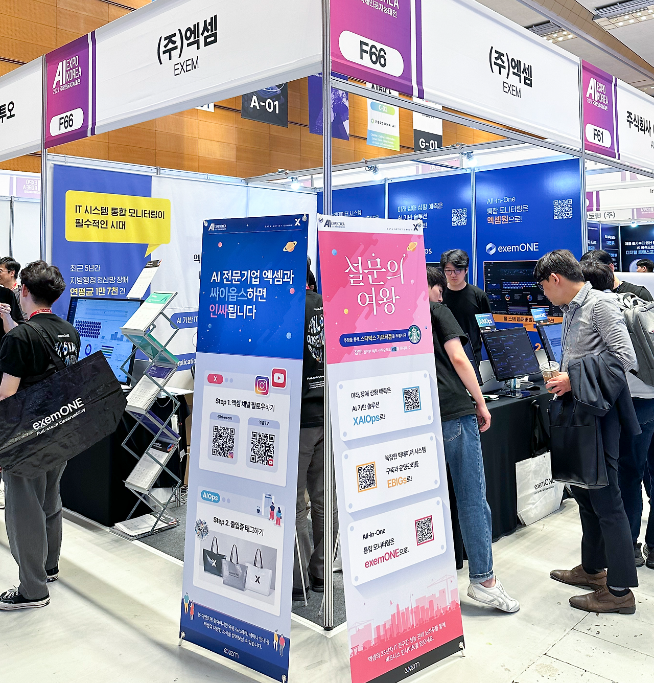 AI를 논하는 자리에 빠질 수 없는 AIOps 솔루션 XAIOps(싸이옵스)는 AI EXPO의 단연 주인공이었습니다. AI와 짝꿍처럼 따라다니는 방대한 데이터들의 저장과 운영 관리를 지원하는 EBIGs(이빅스), 이빅스는 저희가 만들어서가 아니라, 외산대비 가격부터 기능, 지원까지 너무 장점이 많은 솔루션이라 알아서 먼저 찾아주셨습니다. 더 많은 입소문이 나야하는 솔루션이에요. 이어, 참관객분들의 반응이 가장 궁금했던 통합 신규 솔루션 exemONE(엑셈원)까지, 이 세가지 주요 솔루션이 엑셈 부스에 나왔고, 동시 시연되다 보니 참관객 분들이 찾으시는 솔루션을 적재적소로 추천해 드릴 수 있었습니다. 싸이옵스 보러 왔다 엑셈원에 놀라고! 엑셈원 보러왔다 이빅스까지 눈여겨보시고!