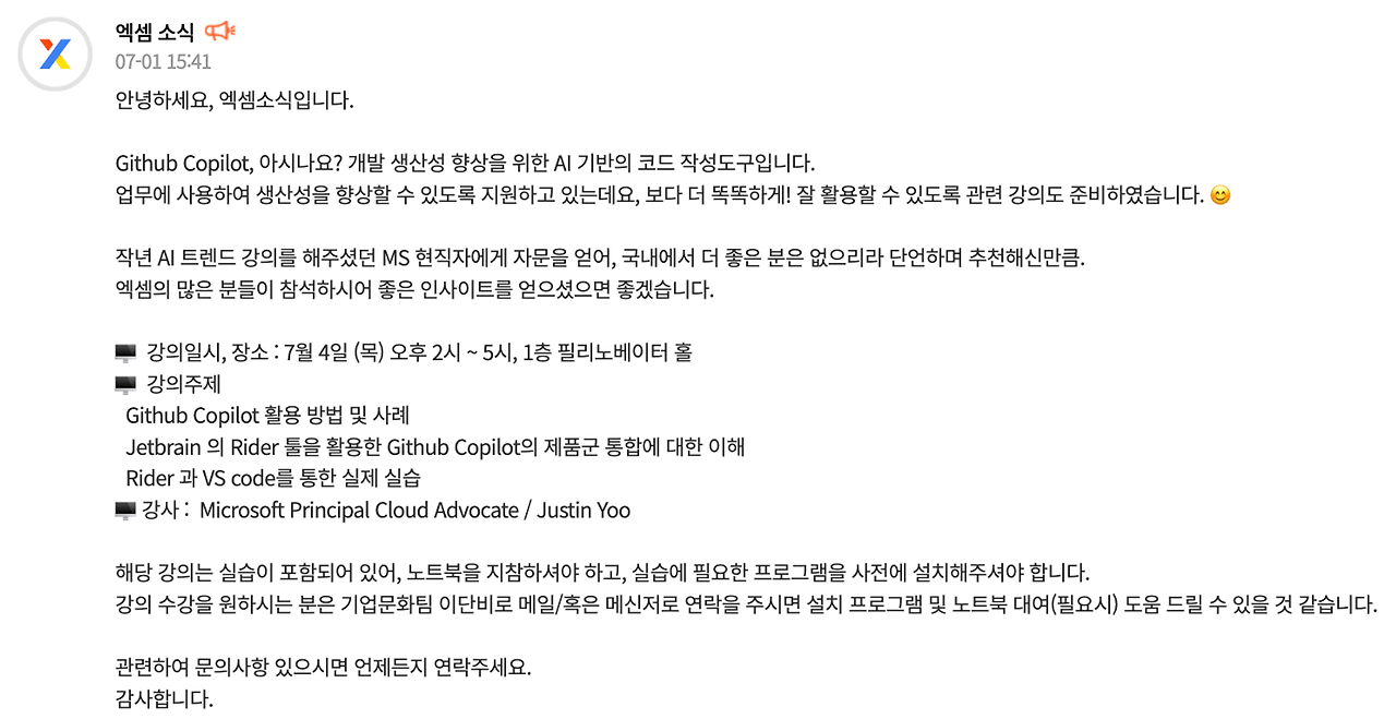 엑셈 소식 채널을 통해 공지 글 하나가 올라왔습니다. 듣고 싶은 사람, 모두 모여라!!