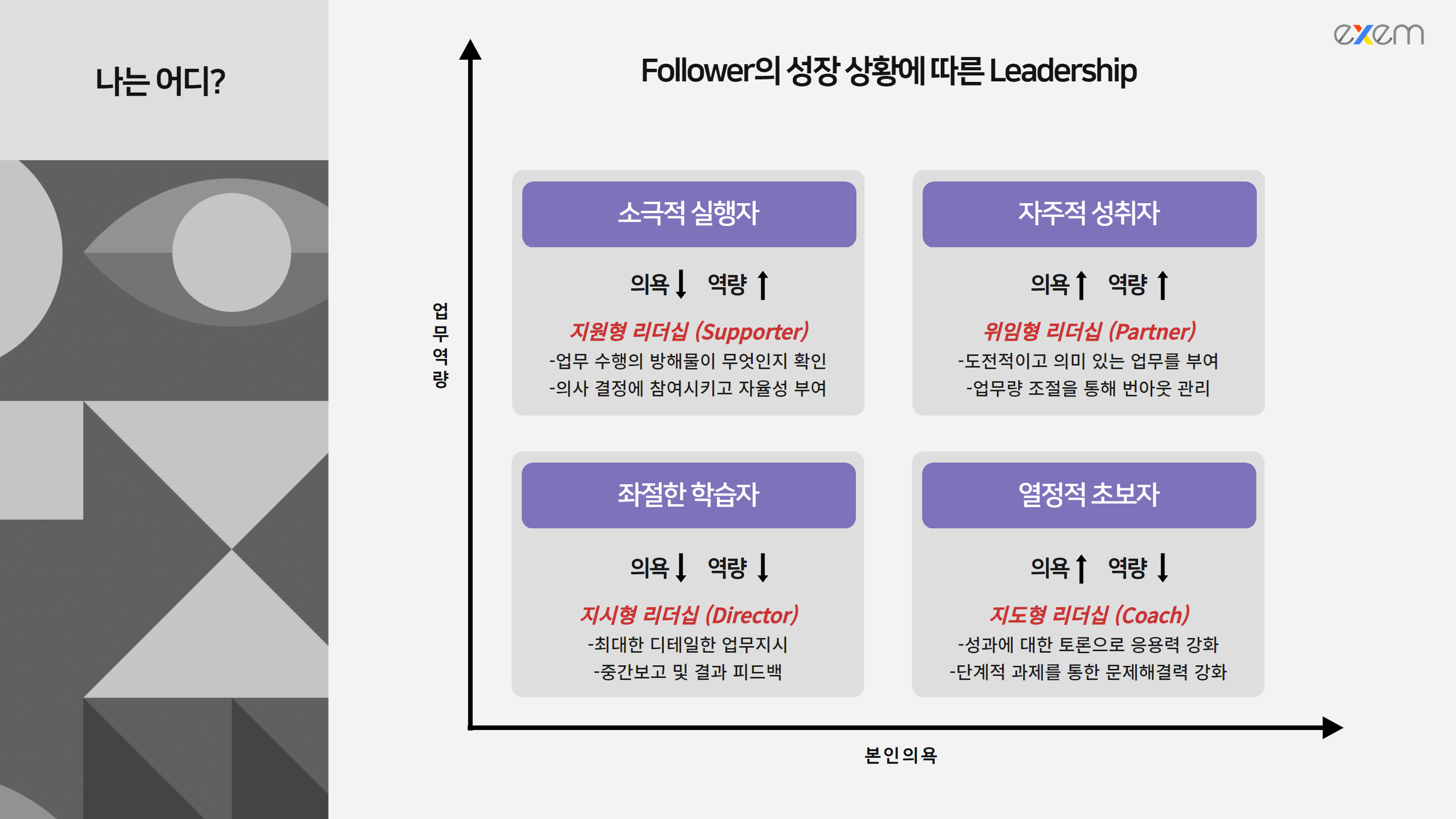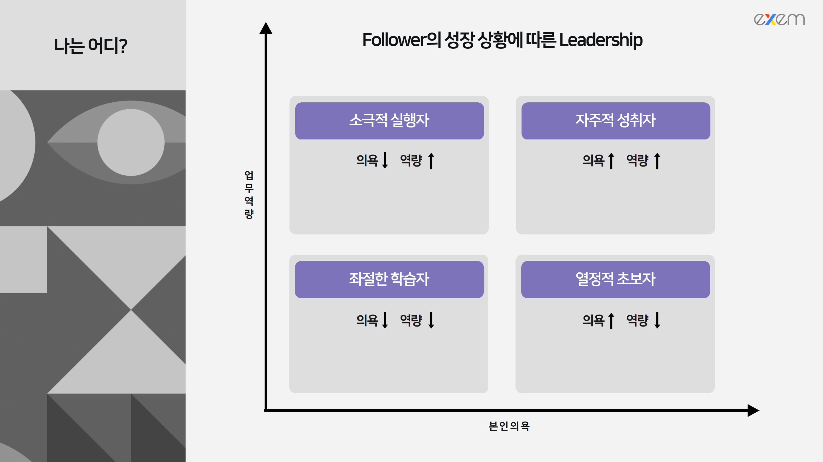 *여기서 중요한 게, 김엑셈이란 팀원이 모든 업무에 있어 '좌절한 학습자' 라고 단정짓기 보다는, 어떤 업무를 수행했을 때 '좌절한 학습자' 카테고리에 가까워 지고, 어떤 업무를 수행했을 때, '자주적 성취자'에 가까워지는 것인지를 파악해야 한다는 겁니다. 누구나 모든 일을 다 잘하기는 어렵거든요.