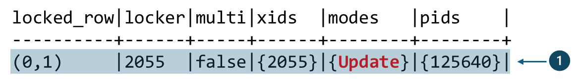 ①pgrowlocks를 조회 결과에서 modes가 {Update}인 것을 통해 첫 번째 트랜잭션인 T1은 ‘FOR UPDATE’ 모드로 Row-level Lock을 설정한 것을 알 수 있습니다. ‘FOR UPDATE’ 모드는 다른 모드와 상호 호환되지 않습니다.