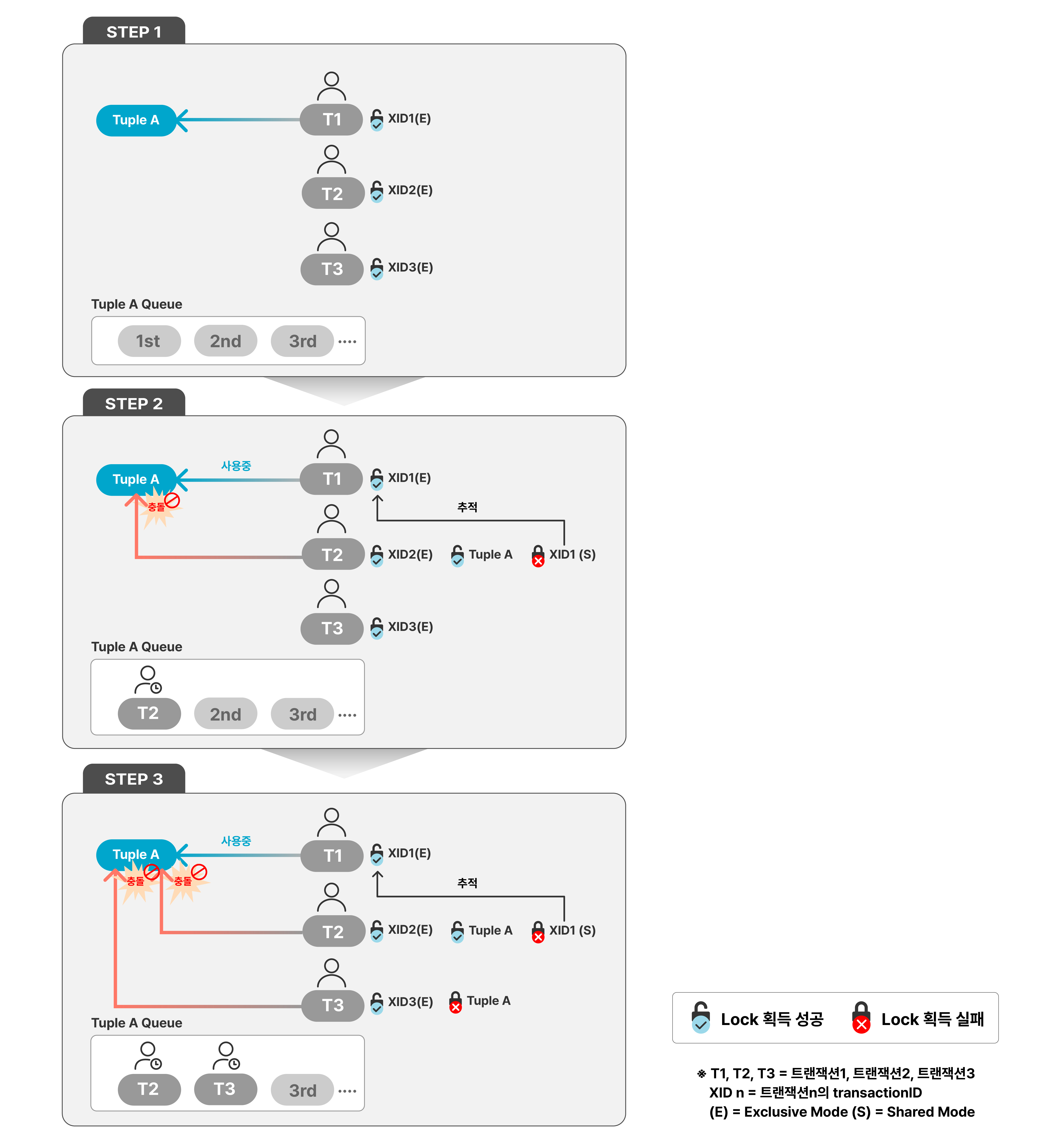 T3도 Tuple A를 수정하고자 접근합니다. 하지만 Tuple A가 다른 트랜잭션 T1이 현재 사용 중이기 때문에, 대기를 위해 T2와 마찬가지로 Tuple A에 대한 Lock을 요청합니다. 그러나 이미 T2가 Tuple A에 대하여 Lock을 획득한 상태이므로 T3는 획득엔 실패하고 Wait Queue에서 자신의 순서까지 기다립니다.
