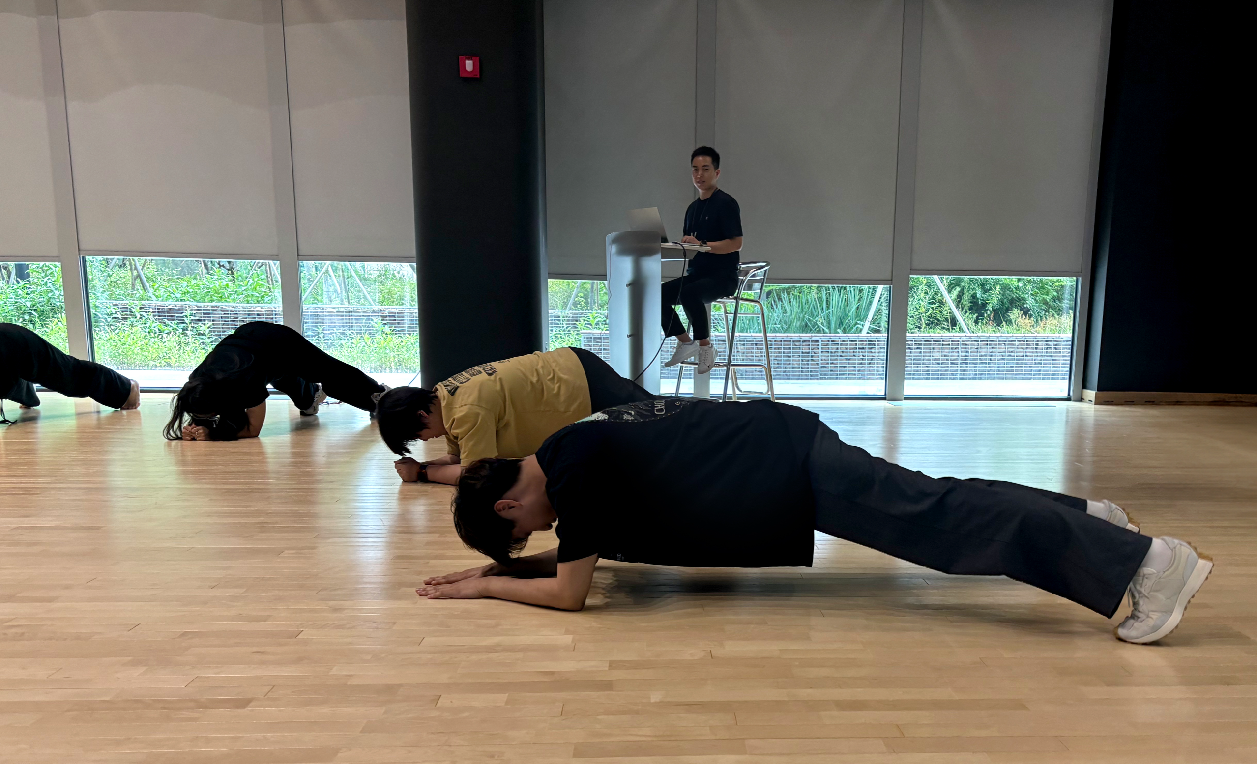 지난 달 외발서기 챌린지에 이어, 이 달은 난이도가 한 단계 더 올라간 플랭크를 도전합니다. 1층 필리노베이터 홀에 모여 300인치 스크린에 타이머를 설정하고, 참여자들은 트레이너 쌤 구령에 따라 플랭크를 시작합니다.