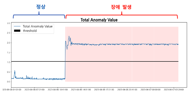 반면, 아래 도표는 Graph-based Network 관계성 모델을 활용하여 모든 지표 값의 변화와 지표 간 관계성을 종합적으로 고려한 결과를 시각화한 것입니다. 이 모델은 개별 지표의 이상 여부를 판단하는 대신, 전체적인 시스템 상태를 분석하여 이상 유무를 판단합니다. 정상 상태와 장애 상황 다소 극단적인 데이터를 사용하였으나, 이 모델은 명확하고 정확하게 이상을 감지해내는 능력을 보여주었습니다. 이는 관계성 기반 접근법이 복잡한 시스템 환경에서 효과적으로 작동함을 입증하는 사례라 할 수 있습니다.