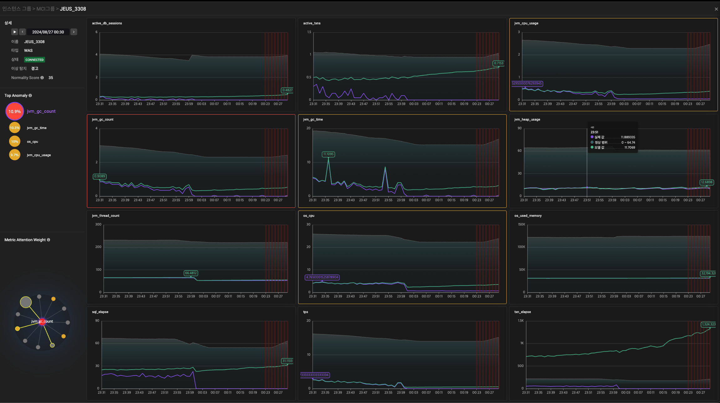 반면, Graph-based Network 모델을 사용한 분석에서는 시스템 시계열 데이터의 각 지표 간 관계성을 명확히 파악할 수 있었습니다. Graph-based Network은 지표 간의 상호작용을 분석하여, 단순한 이상탐지를 넘어 시스템의 전체적인 상태를 평가할 수 있었습니다. 이러한 접근은 데이터 분석의 깊이를 더해주었고, 모델이 실제로 중요한 이상 상황을 더욱 정확하게 탐지할 수 있도록 해주었습니다.
