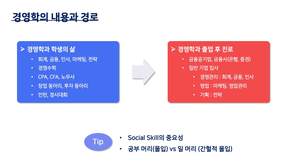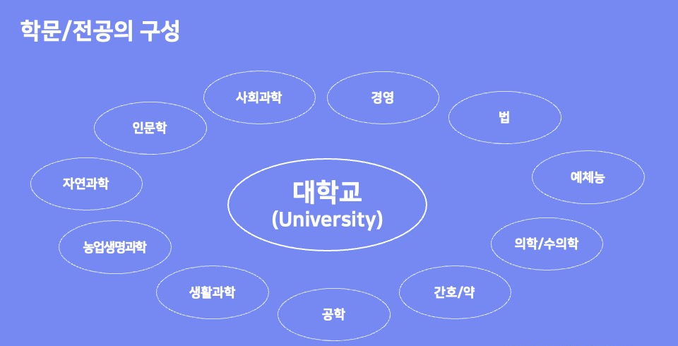- 나라마다 학교마다 교육 체계가 조금씩 다를 수 있지만, 특수 목적이 아닌 일반 대학교의 경우, 학문과 전공의 구성은 크게 위와 같이 구성됩니다. '경영'이라는 큰 범주를 세분화하면, 경영을 다루거나 경영과 연결된 수많은 직군이 존재합니다. 마찬가지로 다른 전공을 선택한다고 해도, 상황은 비슷합니다. 그런데 보통은 대학에 진학한 후에야 이런 세분화된 직종을 제대로 인식하게 되거나, 진로 탐색을 시작하는 경우가 많습니다. 따라서 전공 선택 단계에서부터 다양한 직업군과 진로를 미리 파악하고 준비하는 것이 매우 중요합니다.