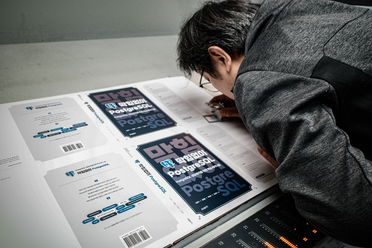 독자분들께서 <막힘없이 PostgreSQL>을 손에 쥐는 순간에 느끼는 감동을 크게 전달하기 위해 책 표지 디자인부터, 내지 선정, 가독성 향상을 위한 내지 레이아웃, 조화로운 배치 등 수많은 고민이 있었습니다. 인쇄소에서 직접 감리를 진행하는 건 당연했구요!
