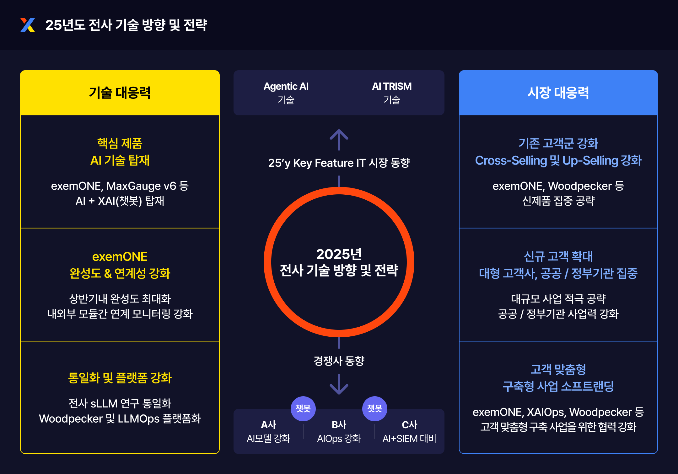 AI는 이제 선택이 아닌 필수로, 엑셈은 주요 제품군에 AI 기술을 최우선으로 탑재하고 있습니다. 특히 올해의 전략 솔루션인 exemONE의 안정성과 완성도를 높이고, 모듈 간 연계 모니터링을 강화하여 엑셈만의 차별화된 포인트를 제시하는 데 집중하고 있습니다. 또한 각 본부에서 연구 · 개발 중인 LLM 기반 챗봇 기술을 통합하여 LLMOps 플랫폼에 탑재하고, 이를 통해 플랫폼화를 강화하는 것을 전사의 주요 전략 과제로 설정하였습니다.