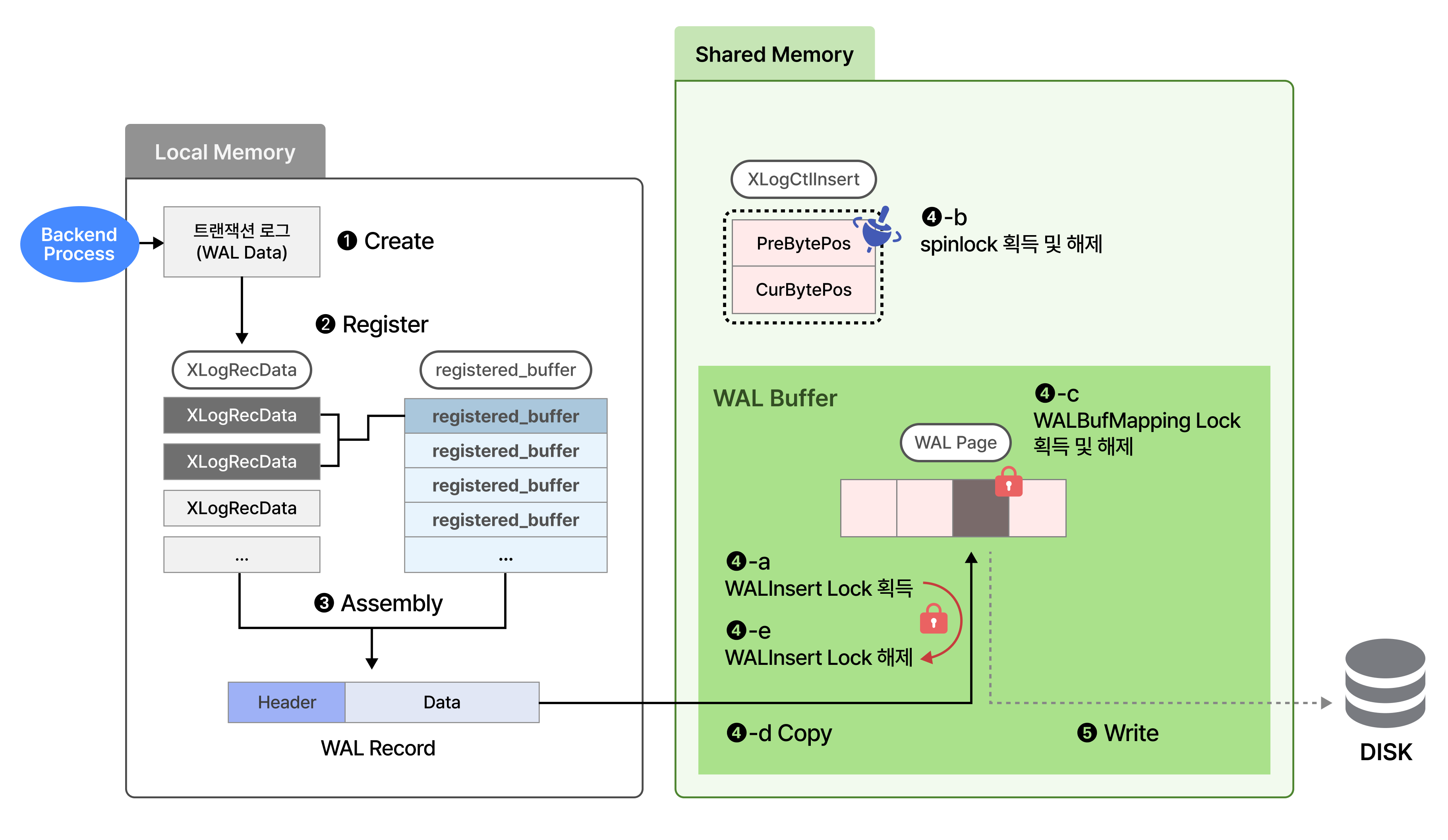 📢 WAL Buffer는 Shared Memory에 위치해있으므로, 프로세스 간 경합을 관리하기 위해 WALInsert Lock, WALBufMapping Lock이 사용되었습니다.
