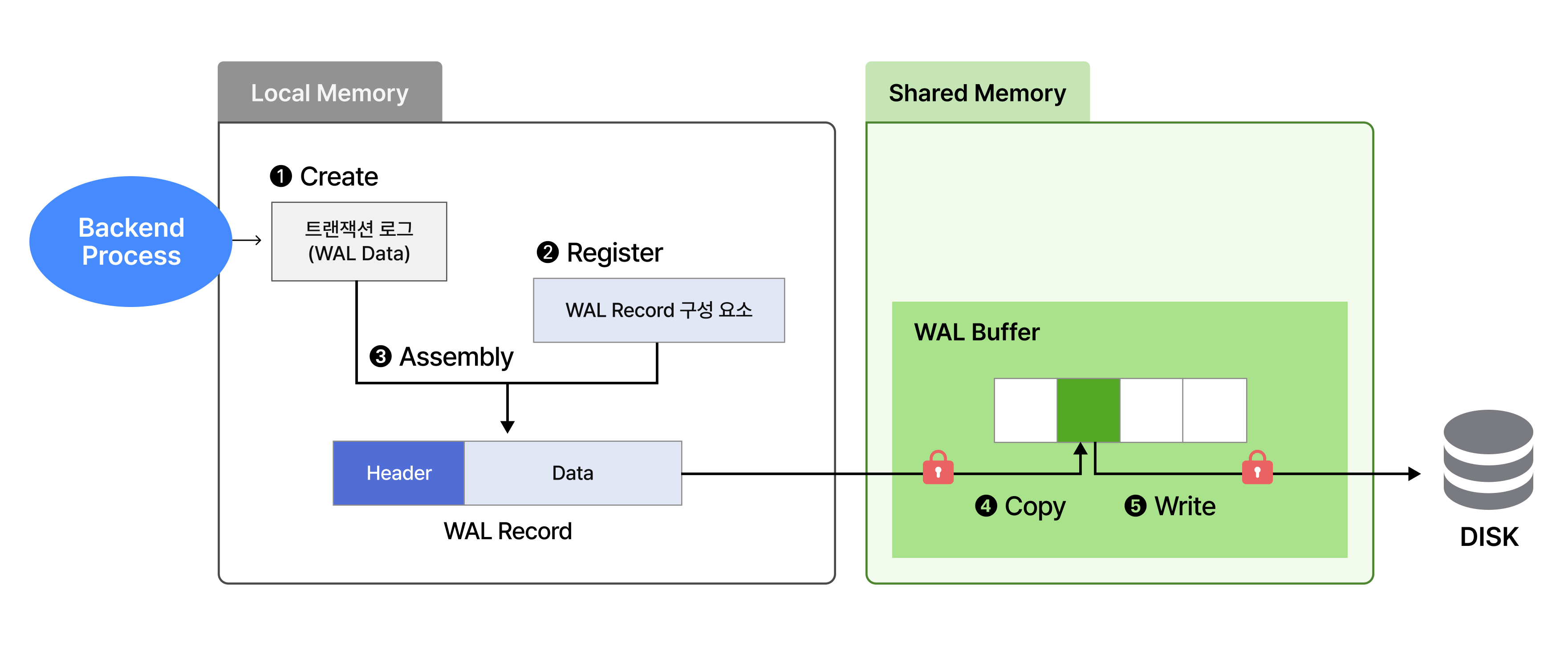 - WAL 동작 과정은 ① WAL Data Create → ② WAL Data Register → ③ WAL Record Assembly → ④ WAL Record Copy → ⑤ Disk Write 순서로 진행된다.