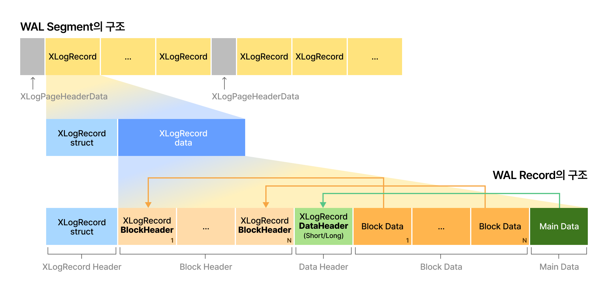 Main Data는 트랜잭션 메타데이터, 변경된 데이터의 값(실제 데이터), 함수 호출 또는 추가 정보, 변경 내역에 대한 설명 등을 포함하고 있으며, XLogRecData 구조체가 여러 개 연결된 리스트 형태로 구성됩니다. 그리고 Main Data에 대한 메타데이터를 가지고 있는 Data Header는 Main Data의 길이에 따라 XLogRecordDataHeaderShort 또는 XLogRecordDataHeaderLong 구조체로 구분됩니다.