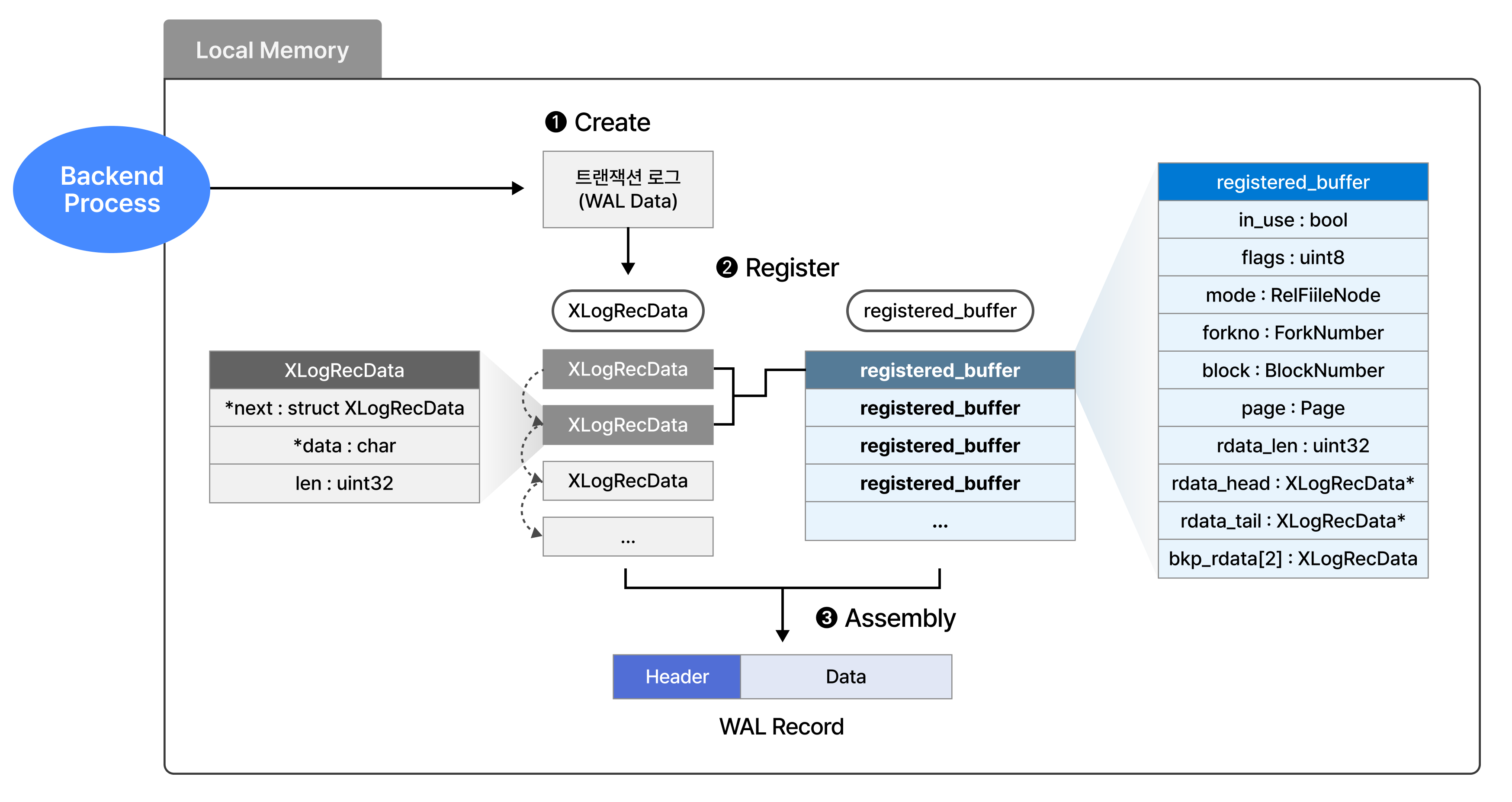 2단계를 통해 준비된, XLogRecData와 registered_buffer(s)를 조합(Assembly)하여 다음과 같이 일반화된 구조에 맞춰 WAL Record를 구성합니다.
