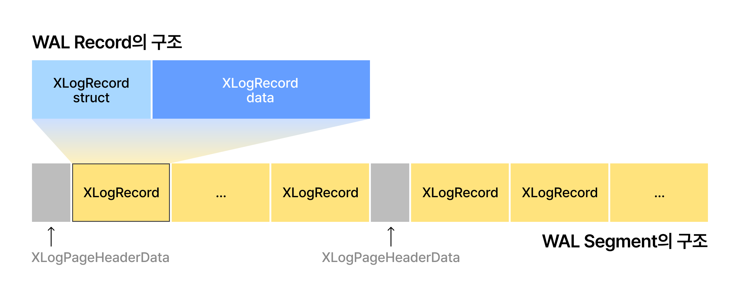 - WAL Data는 XLogRecData라는 구조체로 저장하며, XLogRecData는 연결된 리스트(Chain) 형태로 관리됩니다.
