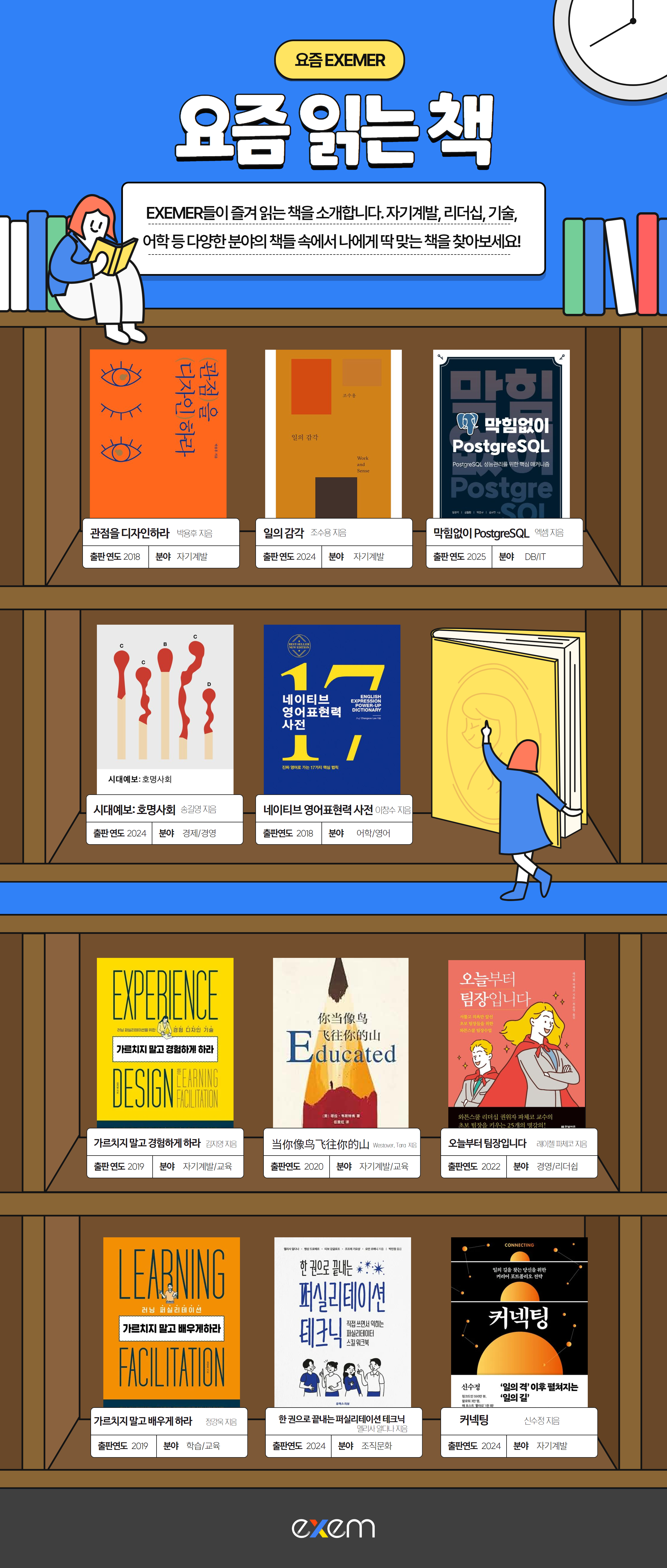 책 쓰는 EXEMER도 있지만, 책 읽는 EXEMER들도 많습니다. 회장님 말고, EXEMER들이 추천하는 도서를 공개합니다. 아직 나들이하기는 조금 추우니까, 따뜻한 캐모마일 한 잔과 함께 엑셈 추천 도서 읽어보자구요.