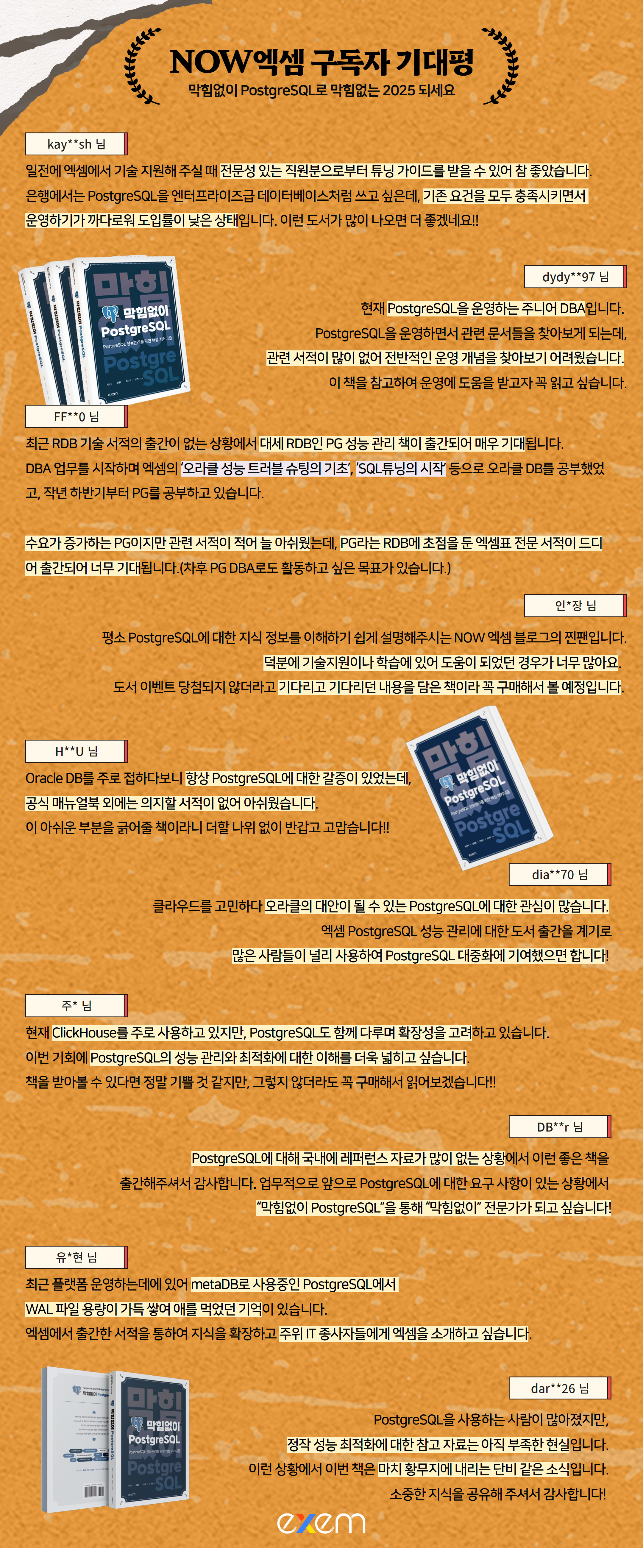 2025년 1월 릴리즈된 화제의 신간 『막힘없이 PostgreSQL: PostgreSQL 성능관리를 위한 핵심 매커니즘』이 전국 서점에 입고되었습니다. 지난 달에 독서 기대평 이벤트를 진행했었죠. 여러분들이 써주신 사연을 읽다 저도 모르게 울컥했습니다. 지식을 매개로 여러분들과 소통하고, 공감할 수 있었으니까요. 블로그라는 한정된 영역에 정말 일부의 사연만 모아봤는데... 여러분들의 엑셈에 대한 사랑이 느껴집니다.