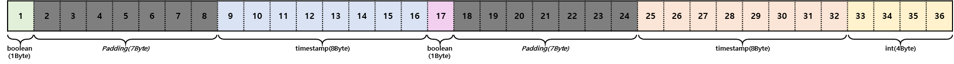 default_col 테이블은 Tuple 헤더 24Btye를 제외하고 36Byte의 크기로 저장되었습니다. t_date 결과는 아래와 같이 구분됩니다. 테이블 생성문으로 예상해 본 Tuple의 크기와 동일합니다.