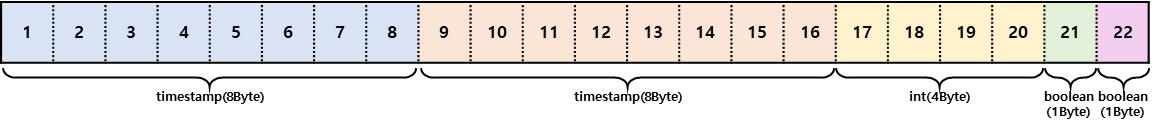 ordering_col 테이블은 Tuple 헤더 24Btye를 제외하고 22Byte의 크기로 저장되었습니다. t_date 결과는 아래와 같이 구분됩니다. 테이블 생성문으로 예상해 본 Tuple의 크기와 동일합니다.