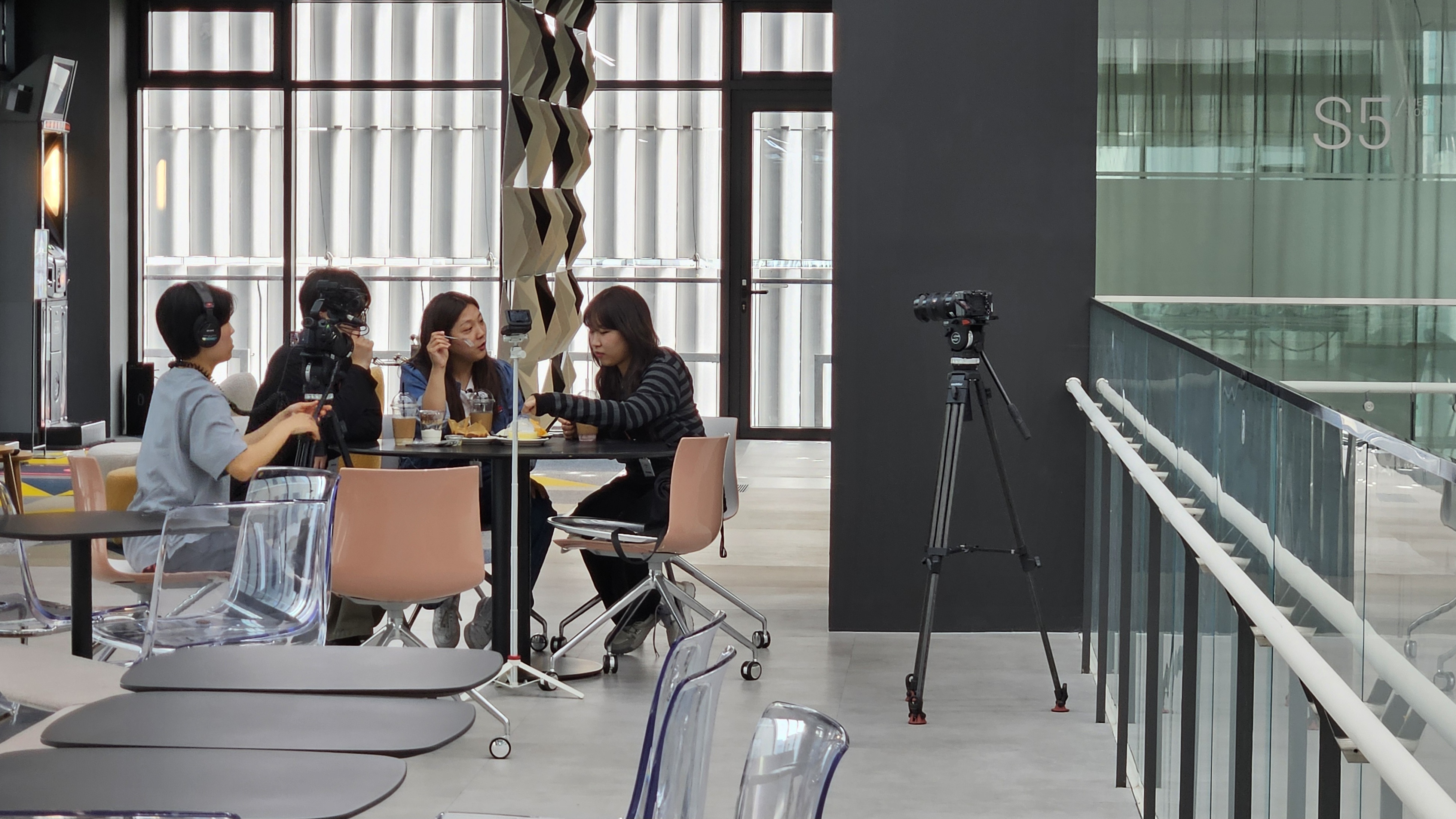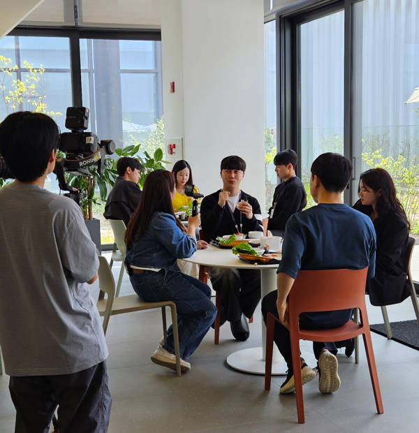 촬영 당일, 오전 9시 45분 맛도리 연출팀과 촬영팀이 방문했습니다. 현장감 있는 촬영을 원했기에 사옥 입장부터 시식, 사옥 투어까지 시간의 흐름에 따라 PD가 쭉 리뷰하는 형식으로 진행될 거라고 소개했습니다. 실제 사옥 투어는 7층부터 1층까지 (배터리 교체 외에는) 원테이크 촬영을 했습니다. HR팀은 이 날 각자의 역할에 따라 하루 종일 PD와 동행하며 대화하는 형식으로 우리의 공간과 복지, 경영 철학을 소개했습니다. 어차피 영상 전문가의 편집 능력은 뛰어날 테니 걱정은 안 했어요. 실제로 어마어마한 전문가임을 증명해 냈습니다. 7시간 촬영하면서, 7시간을 떠들었는데, 7분으로 알차게 편집되었네요 .😂😂😂