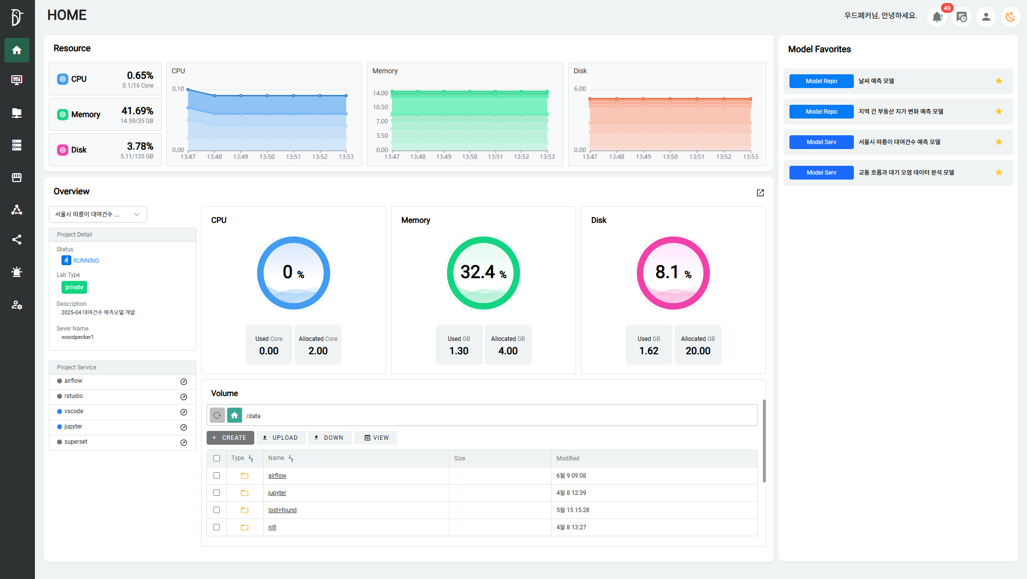 우드페커를 사용하면 단일 플랫폼에서 AI 모델 개발, 학습, 배포와 분석 및 시각화까지 가능하다. 데이터 분석 플랫폼 운영자와 교육생 모두 몇 번의 클릭만으로 개인화된 분석 환경을 생성할 수 있다. 우드페커는 단일 실행과 반복 실행 등 모델 학습 스케줄을 자동화하고, 서버의 분석 자원 할당과 회수에 이르기까지 운영 효율을 높이는 자원 자동 관리 기능도 제공한다. 최대 40명의 사용자가 동시 접속할 수 있는 인프라를 제공하며 다중 사용자 환경에서도 일관된 성능과 서비스 품질을 보장한다. 또한 AI 개발에 필수적인 GPU 상태 모니터링은 물론 각 프로젝트별 자원 상세 정보도 제공한다.